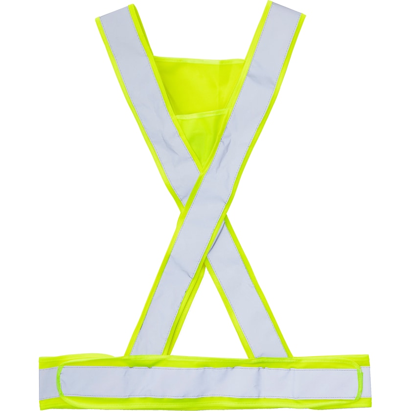 Refleksvest i X-model som fås i flere farver. Refleksvesten har velcrolukninger i siderne som gør at den kan tilpasses til bedst mulige pasform. Trykket laves på de trekantede overflader foran eller bagpå. Refleksvesten er CE-godkendt og godkendt i henhold til EN 13356:2001. Fås i to størrelser der kan blandes frit.
