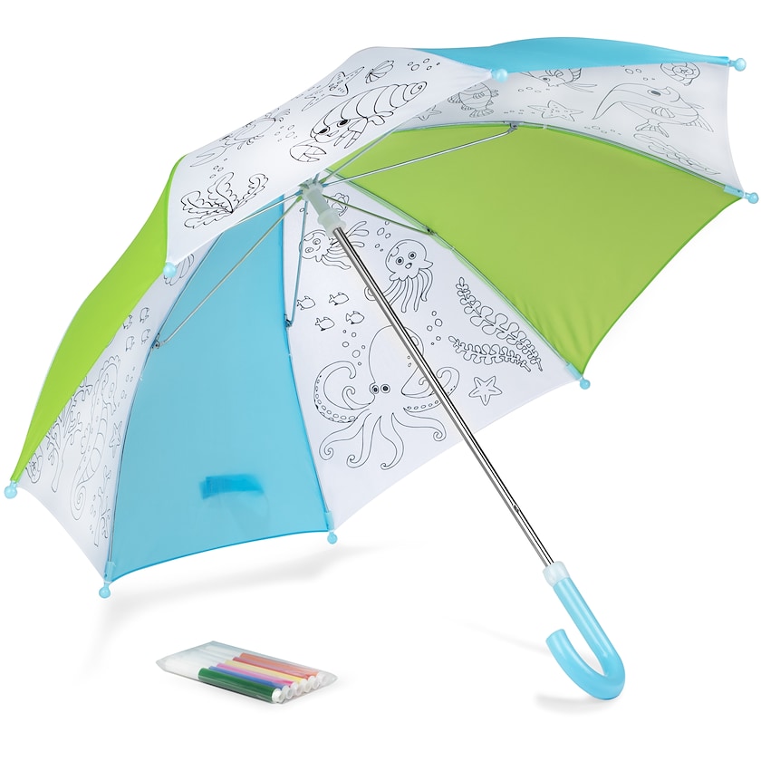 Børneparaply som kan tegnes på. 6 stk. farveblyanter medfølger. Paraplyen er manuel. En reklameartikel som både er praktisk og sjov for barnet!