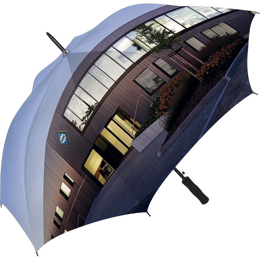 Golfparaply med logo på hele stoffet. Paraplyen har forstærket konstruktion som kan holde til kraftige vindstød. Ribberne er fremstillet af glasfiber og paraplystangen er lavet af galvaniseret stål. Håndtaget er gummibelagt. Paraplyen fremstilles på fabrikken efter bestilling hvilket gør at leveringstiden er længere end normalt.