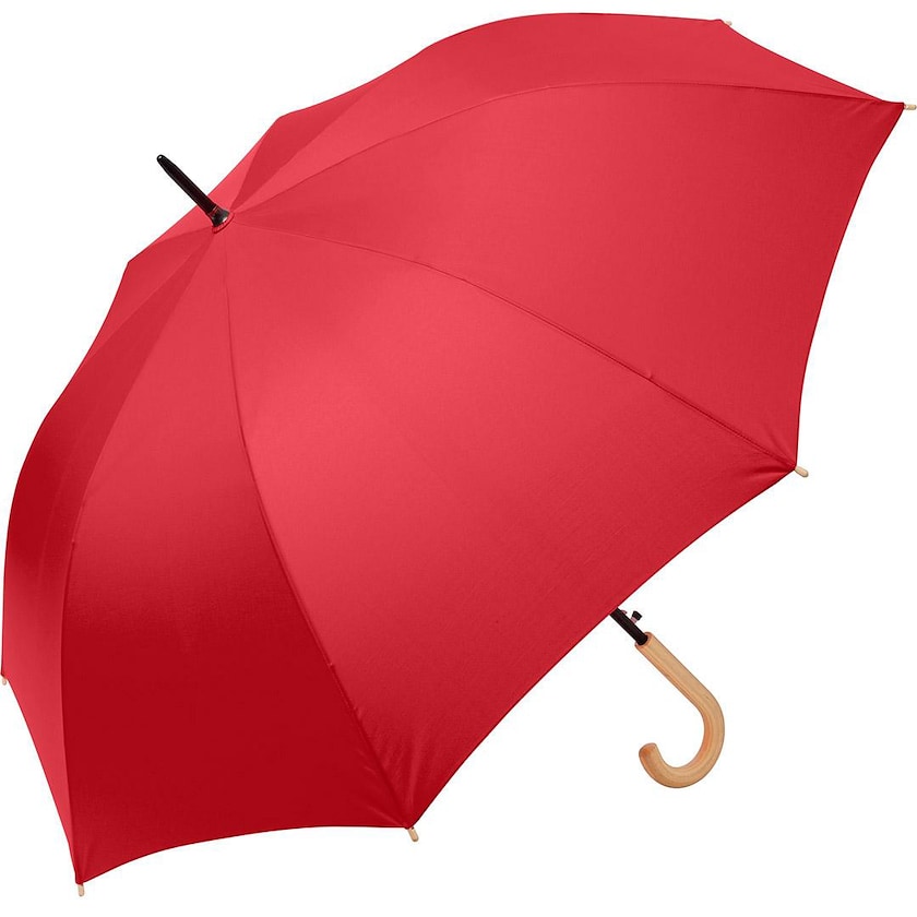 Miljøvenlig golfparaply med stof af genbrugspolyester. Paraplyen har detaljer i ægte træ og genbrugsplast. Håndtaget er af træ. Stoffet er farvet på en miljøvenlig måde som ikke kræver lige så meget vand som normalt.
