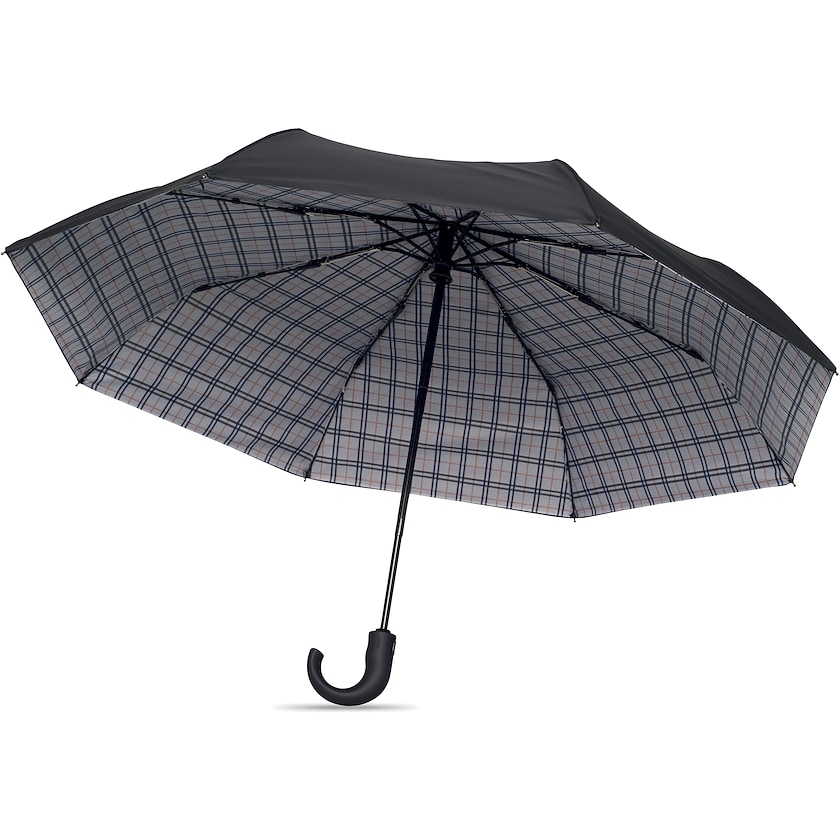 Stormsikker kompakt paraply med ternet stof på indersiden. Ribberne er fremstillet af solidt glasfiber. Håndtaget er lavet af træl. Automatisk åbn- og lukning.