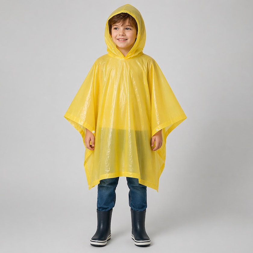 Solid regnponcho til børn. Regnponchoen kan anvendes igen og igen. Leveres i en opbevaringspose, hvorpå trykket laves. Tryk er ikke muligt på selve regnponchoen.