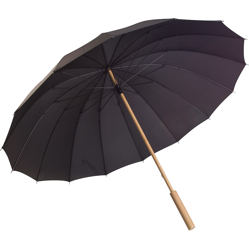 Miljøvenlig storm paraply med detaljer af bambus. Stoffet er fremstillet af rPET, dvs. genbrugte PET-flasker. Paraplystang og håndtag er af bambus og ribberne af glasfiber. Paraplyen er forsynet med en etiket som viser at stoffet er fremstillet af rPET.