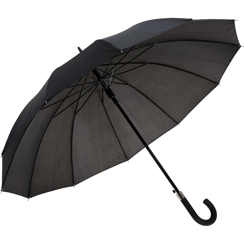 Hel sort paraply med tolv paneler. Paraplyen har gummihåndtag og automatisk åbning.