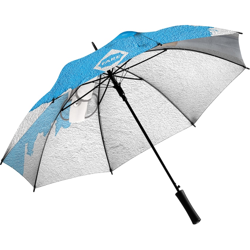 Paraply af god kvalitet med logo udover hele stoffet. Paraplyen har en forstærket konstruktion som kan klare kraftige vindstød. Ribberne er af glasfiber og paraplystangen er af galvaniseret sort stål. Hele stoffets topside trykkes efter dit ønske. Leveringstiden er længere eftersom paraplyerne fremstilles direkte på fabrikken på bestilling.