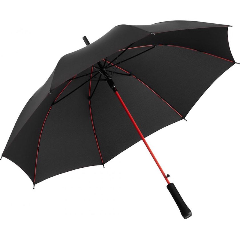Stormsikker paraply med logo med kontrastfarvede detaljer. Ribberne er fremstillet af glasfiber og paraplystangen er af stål. Paraplystoffet er lavet af genbrugspolyester. En paraply af god kvalitet med meget karakter.