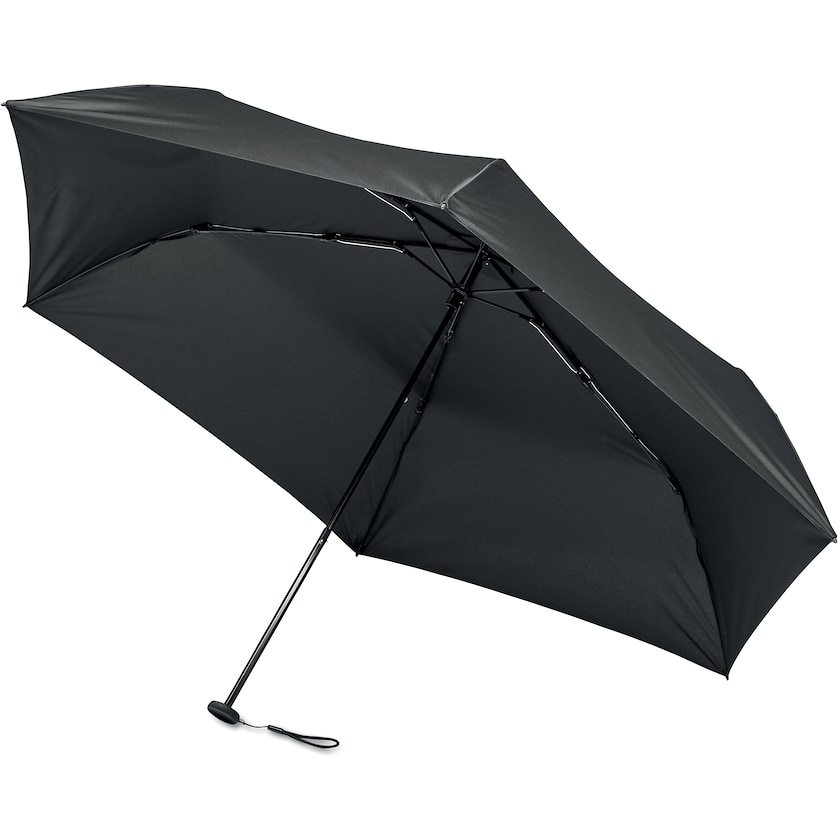 Ultralet, kompakt og stormsikker paraply med logo. Paraplyen har tre sektioner og manuel åbning og lukning. Paraplystangen og paraply ribberne er fremstillet af kulfiber.