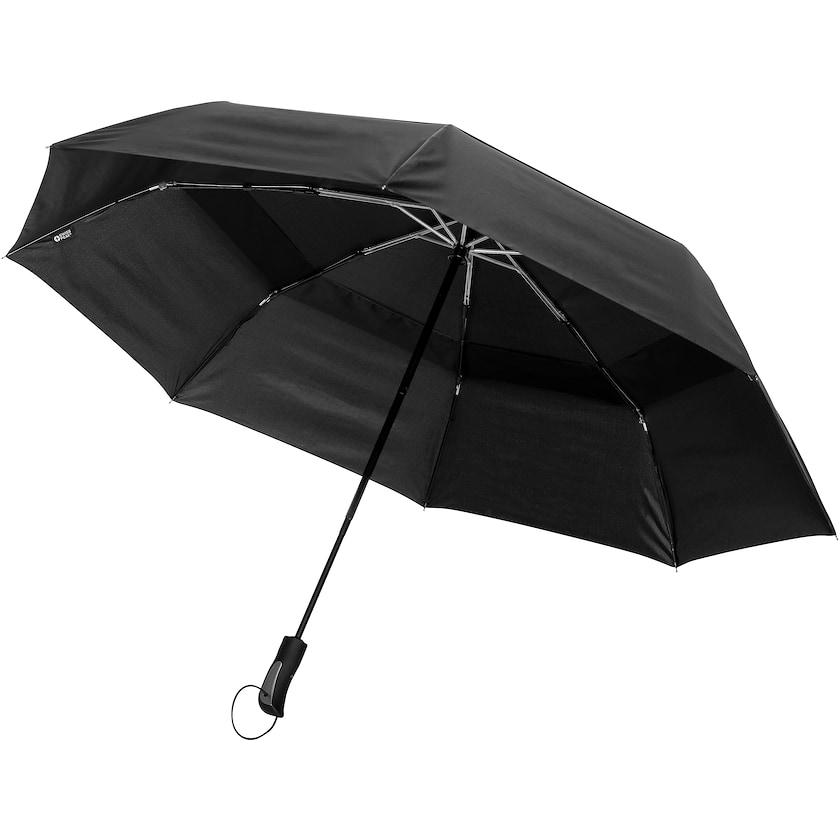 Miljøvenlig paraply som er stormsikker. Paraplyen har stang af aluminium og ribber af glasfiber. Åbning og lukning sker automatisk. Stoffet er fremstillet af genbrugspolyester.