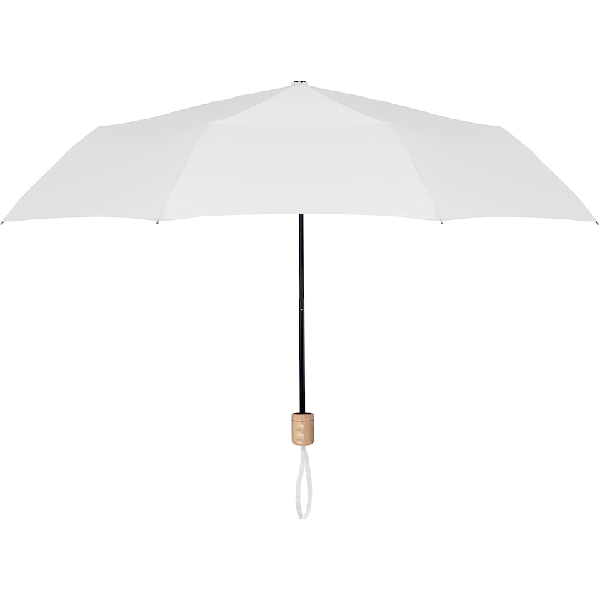 Miljøvenlig kompakt paraply som kan købes fra 10 stk. Paraplyen har tre sektioner og er fremstillet af rPET, dvs. genbrugs PET-flasker. Ribberne er sorte og håndtaget er i naturfarvet træ. Åbnes og lukkes manuelt.