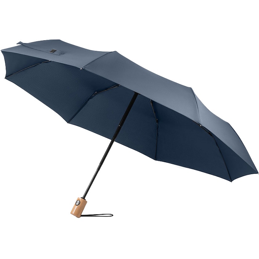 Miljøvenlig kompakt paraply med logo. Stoffet er fremstillet af rPET, dvs. genbrugte PET-flasker. Ribberne er fremstillet af glasfiber og håndtaget af træ. Åbning og lukning sker automatisk.