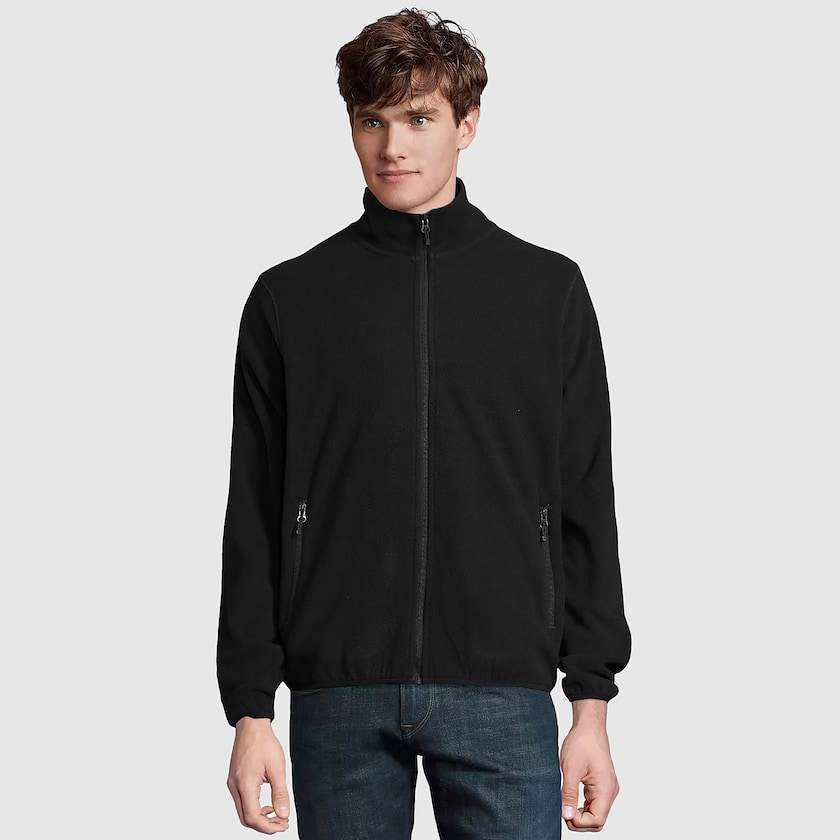 Miljøvenlig fleecetrøje til mænd som kan købes fra 5 stk. På siderne er der lommer med lynlåse. Stoffet er fremstillet af 100% genbrugspolyester.