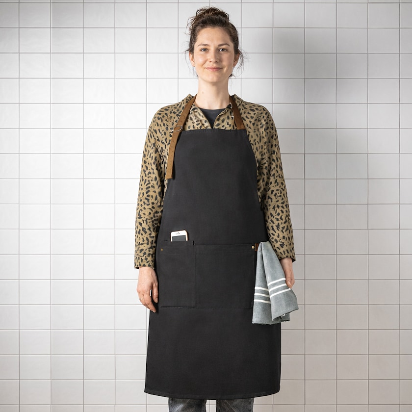 Forklæde af bomuldslærred med detaljer i metal. Forklædet har tre smarte lommer og en slids i siden hvor fx et viskestykke kan hænges. Leveres i en naturfarvet papkarton af miljømærket karton.