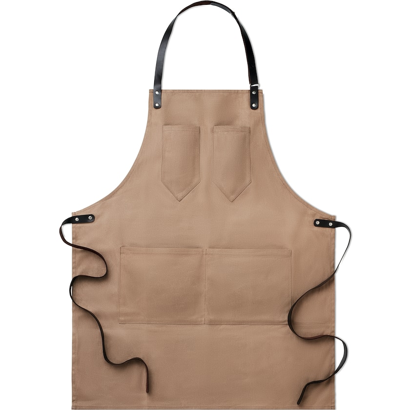 Forklæde i topkvalitet. Finn er af voksbehandlet canvas med læderdetaljer og metalknapper, og har to brystlommer samt store lommer nederst. Et perfekt valg til dig som søger højkvalitets forklæder med tryk!