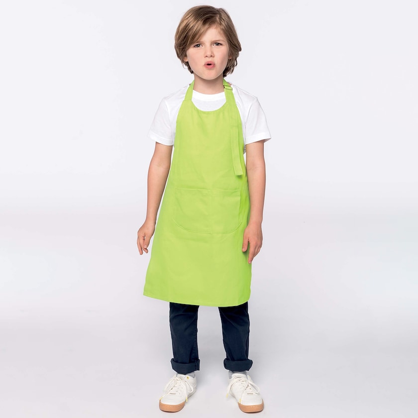 Forklæde til børn af kraftigt bomuld. Forklædet har dobbelte lommer på maven.