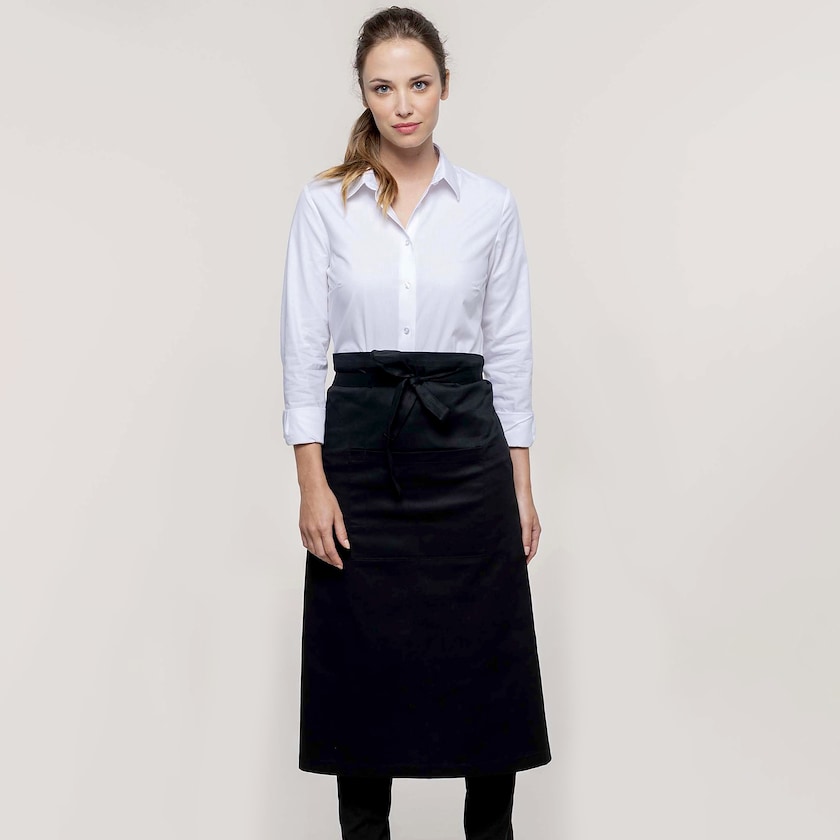 Langt forklæde i høj kvalitet. Forklædet er produceret i en solid polyesterblanding. Foran findes en stor lomme med plads til kuglepen. Længde 80 cm, bredde 90 cm.
