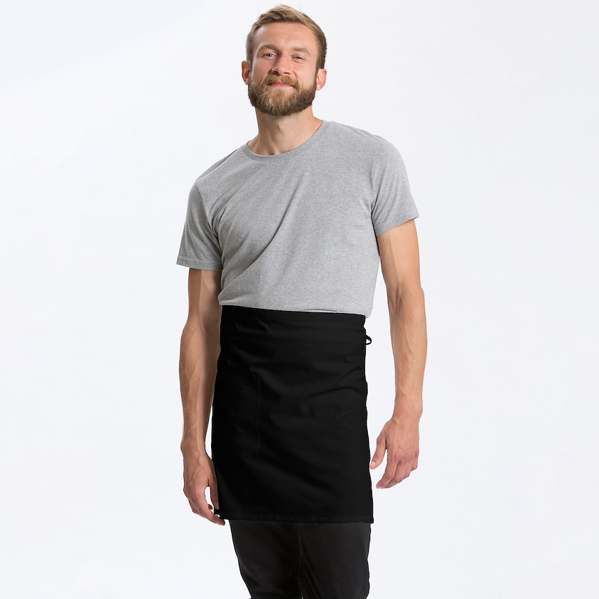 Kort forklæde i økologisk og Fairtrade-certificeret bomuld. Certificeret i overensstemmelse med Fairtrade, EU Ecolabel, SA8000 og Oeko-tex. Forklædet er forsynet med stofmærker, der viser at det er produceret af Neutral og opfylder kravene til at blive kaldt Fairtrade.