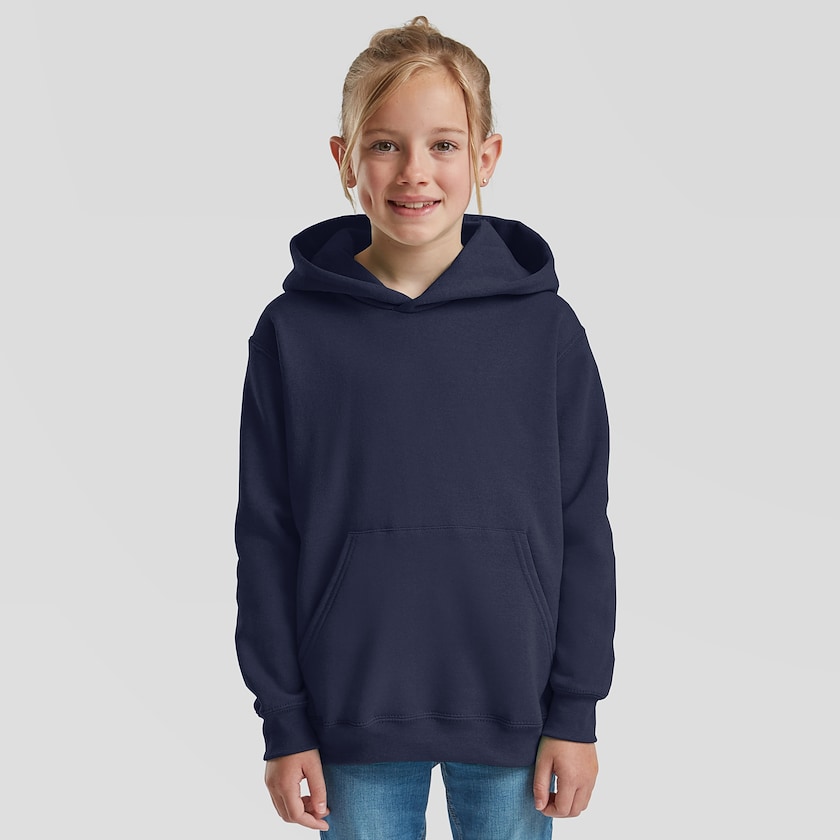 Fruit of the Looms klassiske hættetrøje i børnestørrelser. Trøjen har ingen snørre i hatten, af ren sikkerhed for barnet. Leveres pakket stykvis i plastposer.