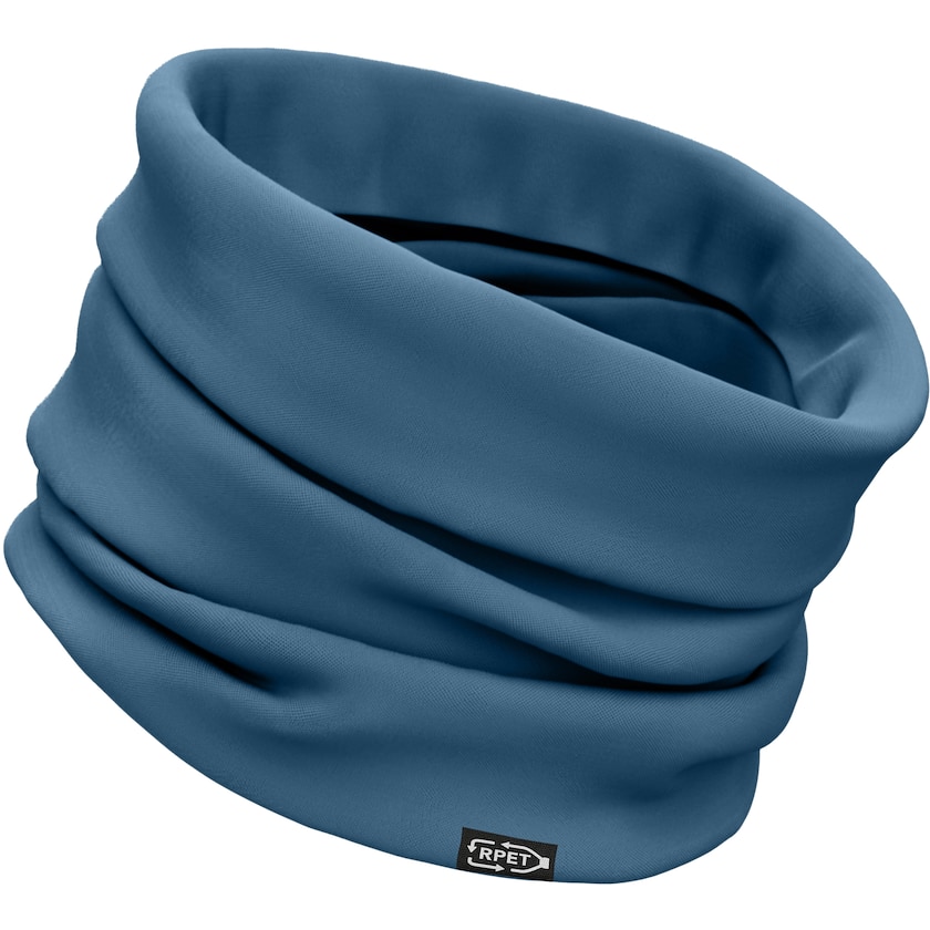 Rørhalstørklæde i miljøvenligt materiale. Delmont er fremstillet af rPET, dvs. genbrugs PET-flasker. Rørhalstørklædet er forsynet med en etiket som viser dette.