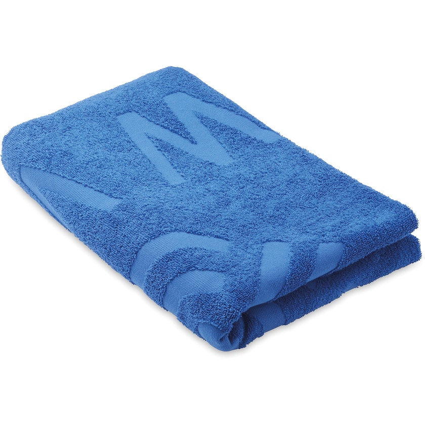 Badehåndklæde med din logotype i relief. Hvor dit logo optræder, mangler stoffets normale frottéløkker, hvilket skaber en smuk reliefeffekt. Ryggen er uden aflastningseffekt. Du vælger selv farven på håndklædet ved at indtaste den ønskede Pantone-kode. Stoffet vejer 350 g/m². Badehåndklæderne leveres individuelt pakket i polyposer. Fremstillingen foregår i Europa.