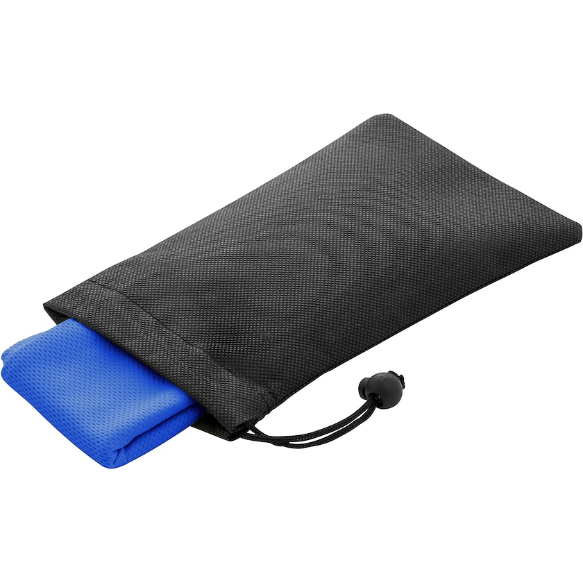 Miljøvenlig sportshåndklæde i sort opbevaringspose. Håndklædet er køligt selv når det er vådt. Håndklædet er fremstillet af rPET, dvs. genbrugs PET-flasker. Opbevaringsposen er af non-woven-materiale. Trykfladen på håndklædet er 100 x 60 mm og 140 x 80 mm på opbevaringsposen.