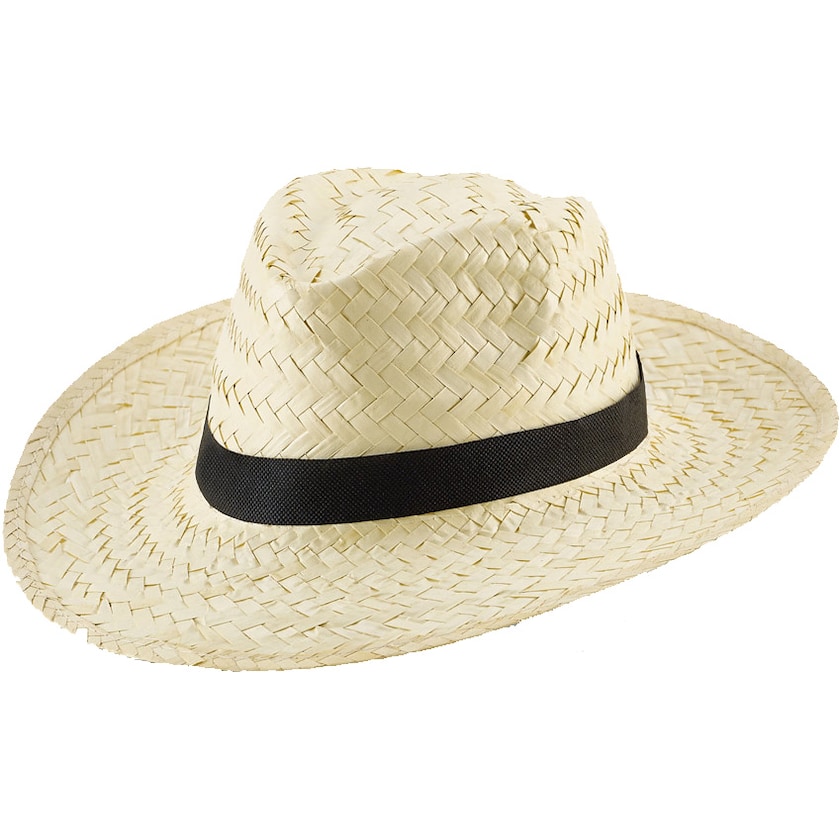 Hat af ægte halm med band med eget logo. Vælg mellem hvid eller sort hattebånd. Band er fremstillet af polyester.