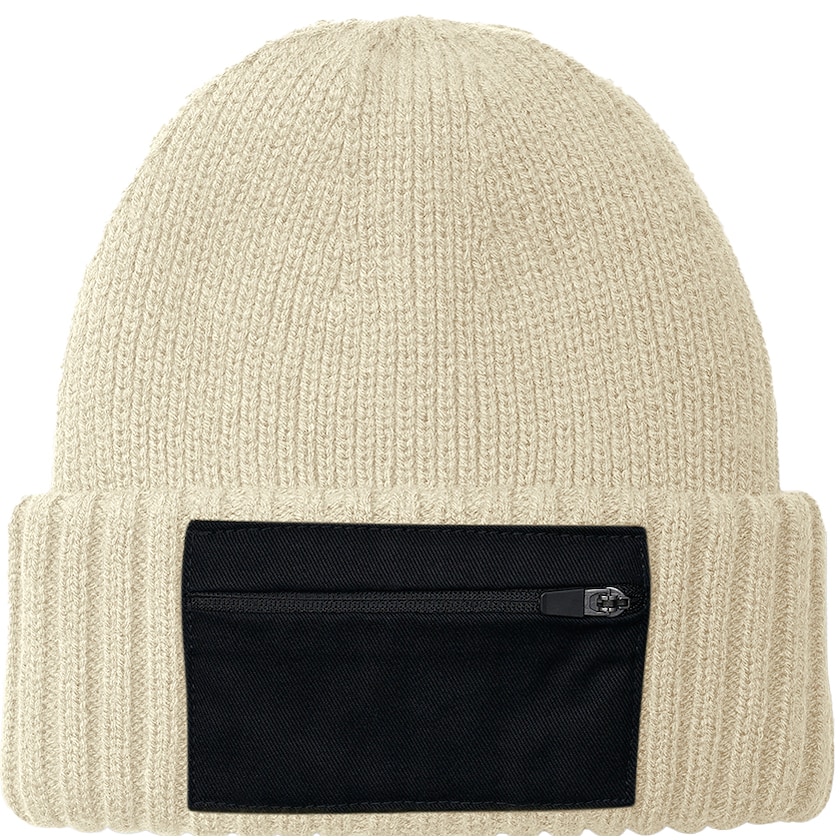 Beanie hue med påsyet lomme foran. Atlanta har et miljøvenligt stof af 50% genbrugspolyester og 50% akryl. Mærkning laves med brodering på foldningen.