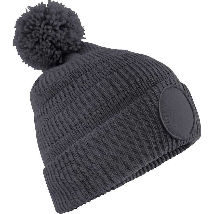 Beanie hue med rund etiket med plads til dit logo. Beanie huen er et stof med lækkert designmønster og er fremstillet af 100% GRS-certificeret polyester.