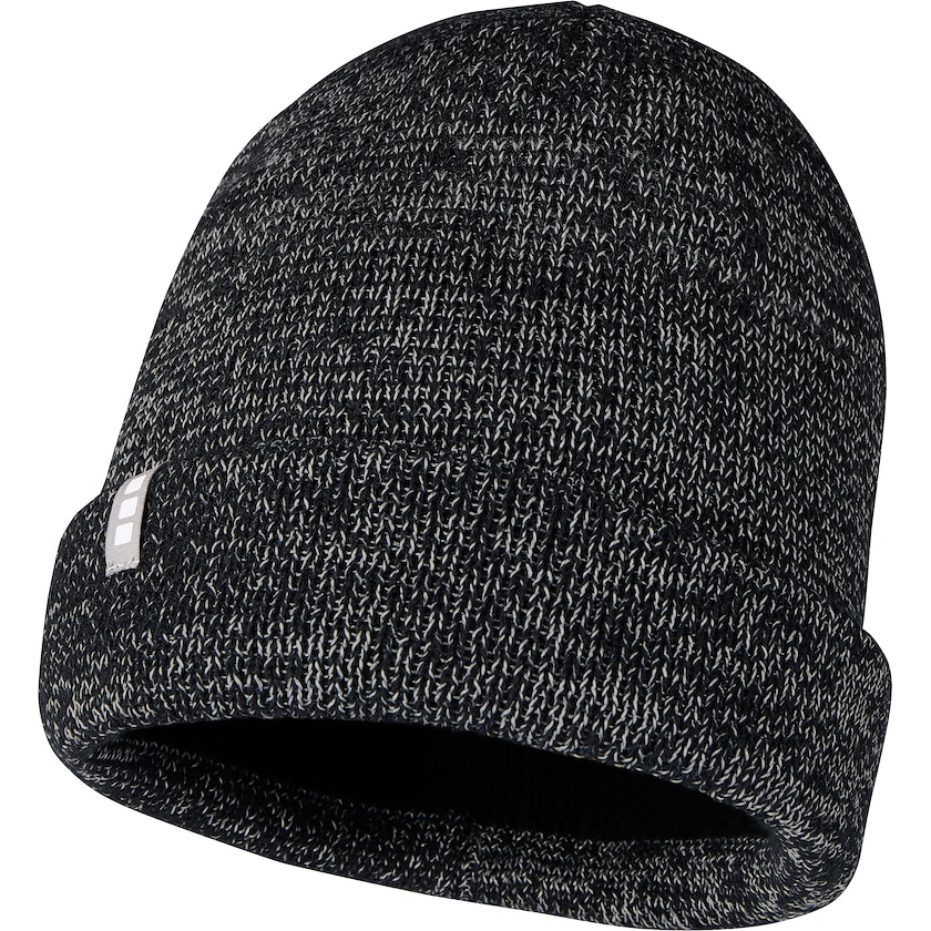 Beanie hue med reflekterende stof. Beanie huen har fold op og en lille etikette som viser at den er fra Elevate. Stoffets refleksevne må ikke erstattes med almindelige reflekser, men fungerer som et supplement. Mærkning laves med brodering.