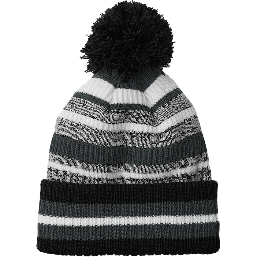 Miljøvenlig beanie huse med stribet stof og stor kvast. Beanie huen er fremstillet af 100% genbrugspolyester som er certificeret i henhold til Control Union CU811033.