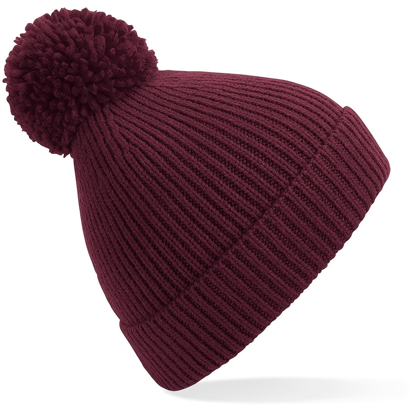 Højkvalitets ribstrikket beanie hue med stor pompon. Huen har øverst et specialsøm for øget komfort.