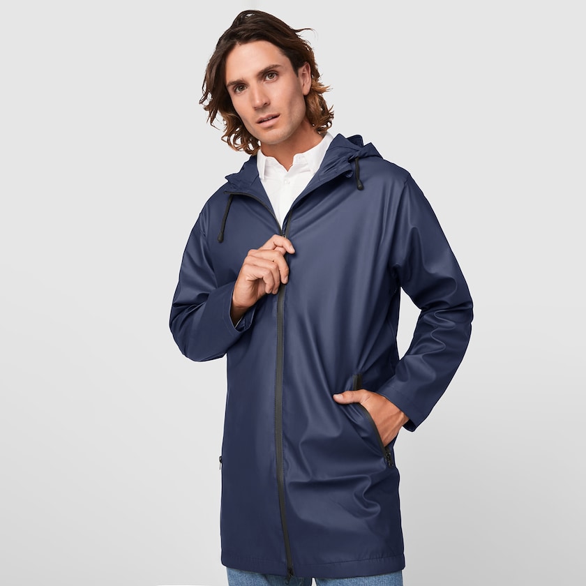 Regnponcho med hætte i herremodel. Regnponchoen er vandtæt og har to sidelommer med lynlås. Roly er små i størrelserne så vælg gerne en størrelse større hvis du normalt er mellem to størrelser. Findes også som damemodel.