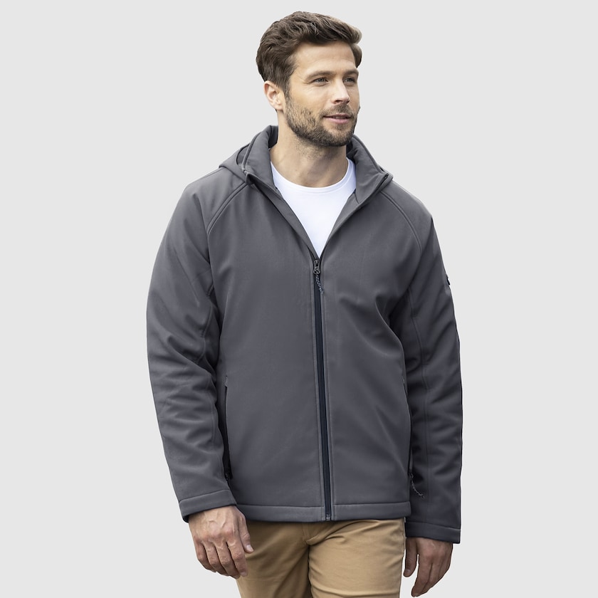 Softshell jakke i herremodel. Jakken har en moderne design med aftagelig hætte. Sidelommer og ærmelommen har lynlås. Indvendigt er der en større inderlomme. Findes også som damemodel.