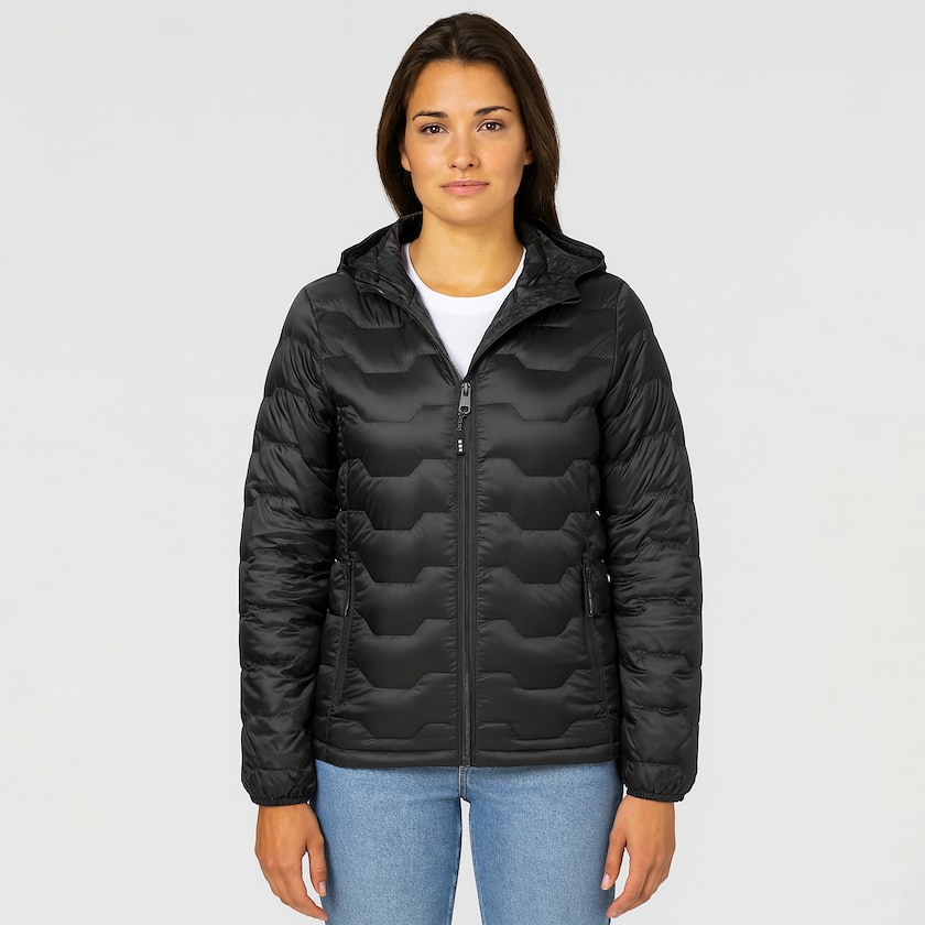Vinterjakke for damer helt af genbrugsmateriale. Jakken har et smukt quiltet stof lavet af genbrugsnylon. Sidelommerne er udstyret med lynlås. Alle detaljer, såsom lynlåse, er af genbrugsmateriale. Foret består af 90% genbrugsdun og 10% genbrugsfjer. Jakken er GRS-certificeret. En luksus vinterjakke, der er godt for miljøet. Findes også som herremodel.