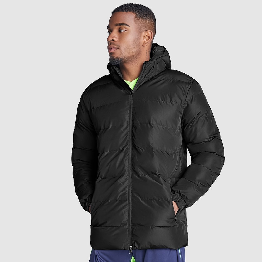 Kraftig dynjakke med hætte. Jakken har to sidelommer med lynlås og en indvendig brystlomme. Vind- og vandtæt.