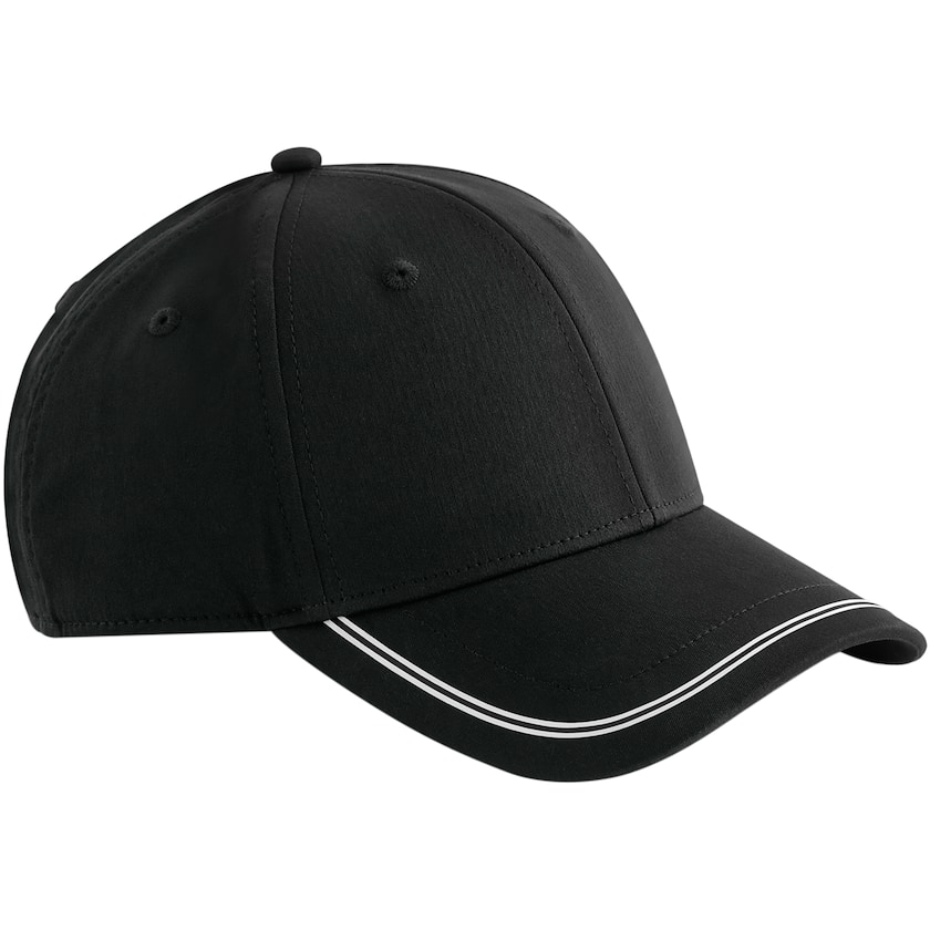 Caps med striber, der løber langs skyggen. Caps er fremstillet af 100% GRS-certificeret genanvendt polyester. Fronten er struktureret, og kasketten er buet.