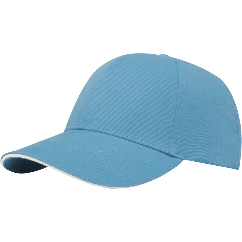 Sporty kasket i genbrugsbomuld. Kasketten har en skygge med piping. Bagtil har kasketten et metalspænde. Stoffet er fremstillet af 50% genbrugsbomuld og 50% bomuld.