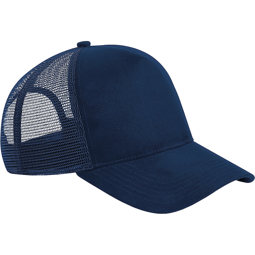 Truckerhat med forside og skygge i ruskind. Materialet gør at kasketten får et unikt udseende. Mærkning sker med brodering.
