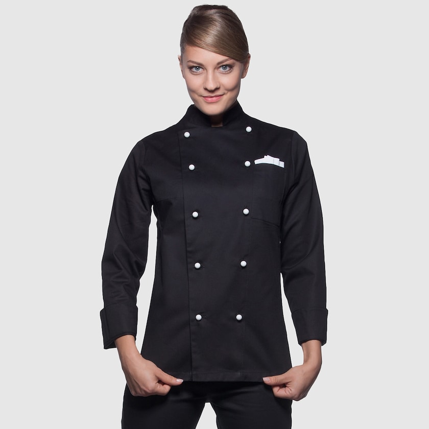 Kokkejakke til damer. Jakken har figursyet pasform og lukkes med 10 løse knapper (medfølger ikke). På venstre bryst er en brystlomme. Kokkejakken tåler industrivask op til 95 grader. Findes også som herremodel.