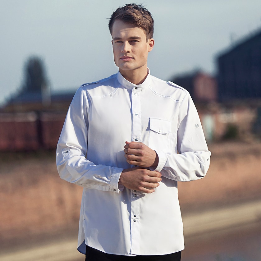 Moderne kokkeskjorte i kvalitetsstof. Stoffet er af typen easy care. Skjorten lukkes med 5 trykknapper. Klarer industrivask op til 95 grader.
