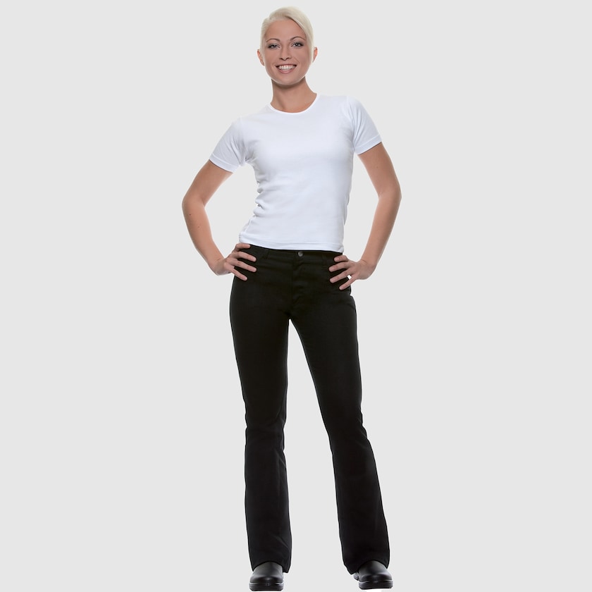 Kokkebukser med fem lommer. Stoffet er af typen easy care. Hvide bukser klarer industrivask op til 95 grader og sorte op til 60 grader. Findes også til mænd.