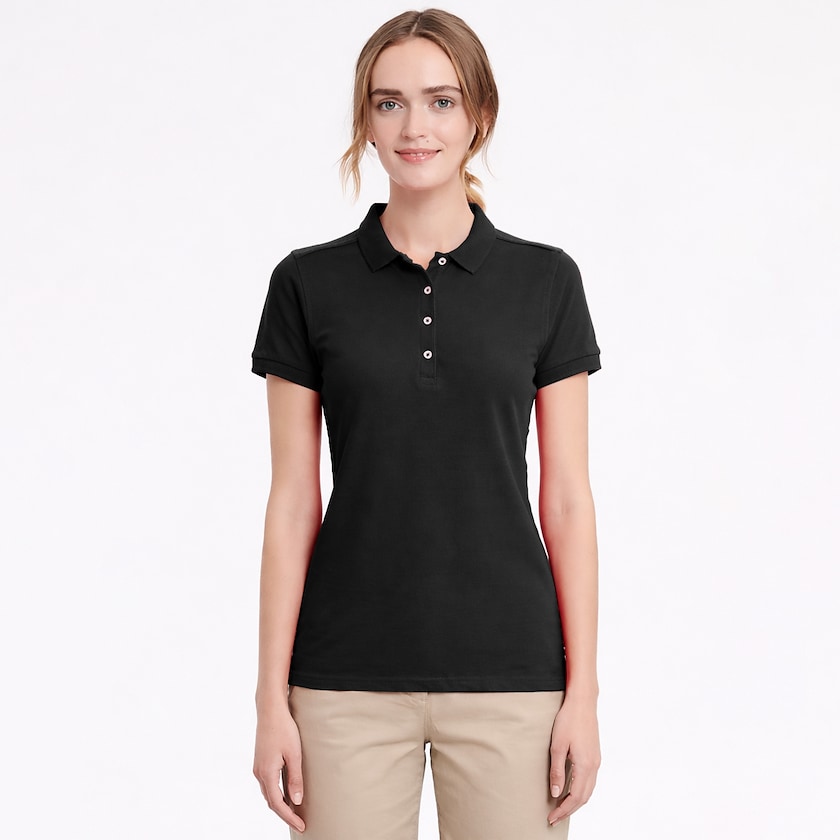 Slim-fit polo til kvinder med stretch i stoffet. Stoffet består af 5% lycra hvilket gør poloen behagelig at have på. Leveres stykvis pakket i plastikpose. Findes også som herremodel.