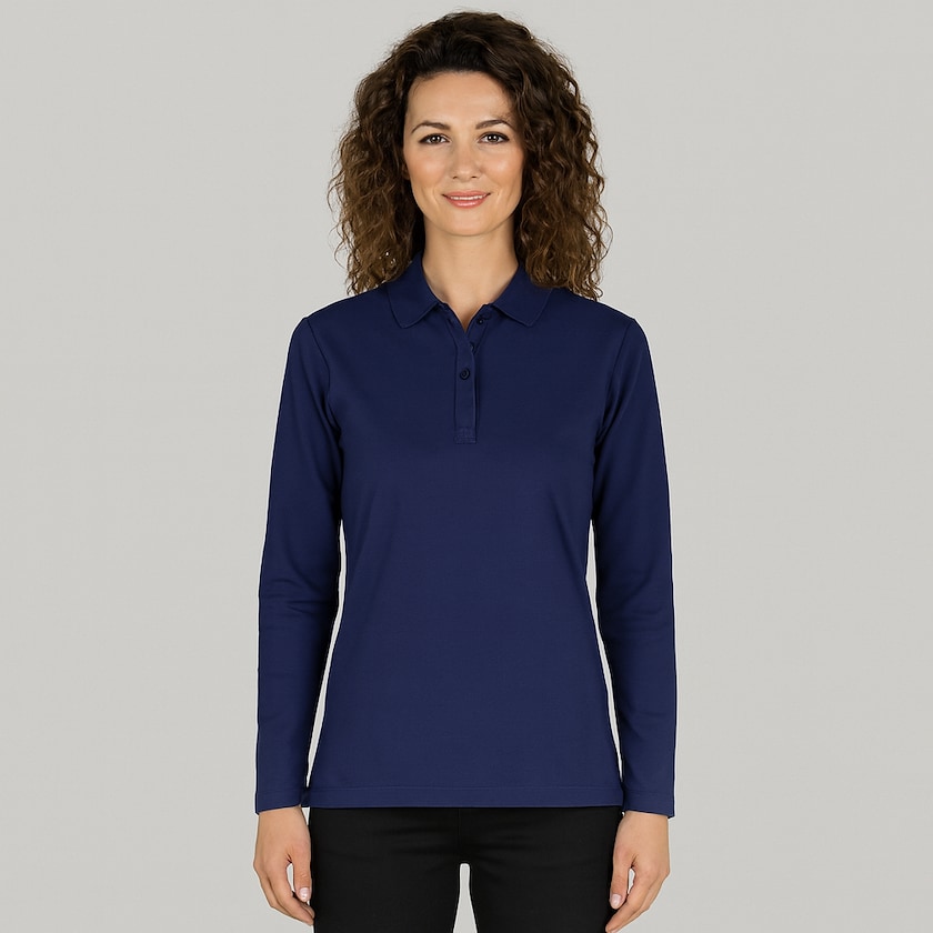 Langærmet polotrøje til damer. Polotrøjen er fremstillet af kraftigt bomuldsstof. Knapperne i halsen matcher stoffet. Mærkningen kan enten laves med tryk eller brodering. Findes også som herremodel.