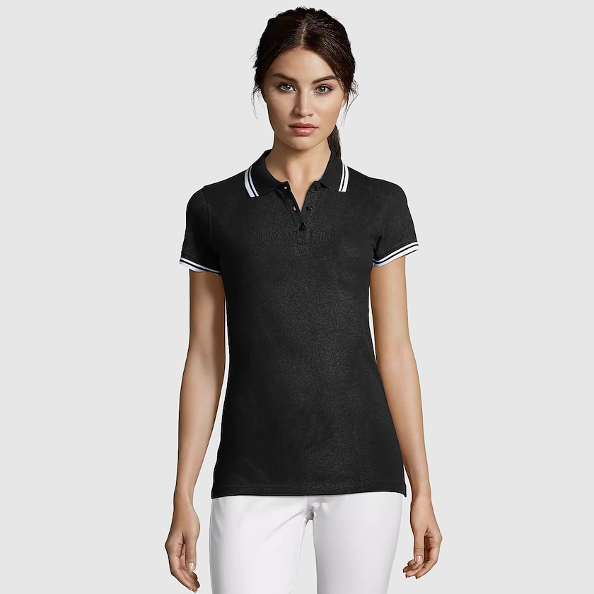 Polotrøje til damer med stribede kanter på krave og ærmer. Polotrøjen er med moderne pasform og er fremstillet af et 200 grams bomuldsstof som er OEKO-TEX-certificeret. Polotrøjen kommer med tre knapper i halsen. En tidløs klassiker! Findes også som herremodel.