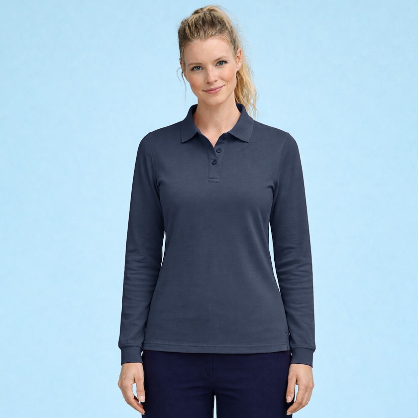 Langærmet polotrøje af 100% bomuld. Trøjen har slidser i siderne og tre knapper i halsen.