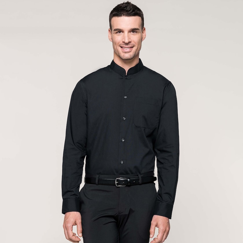 Herreskjorte med kinakrave. Skjorten er lavet af et slidstærkt stof af typen Easy Care. Leveres individuelt pakket i plastikpose. Findes også som damemodel.