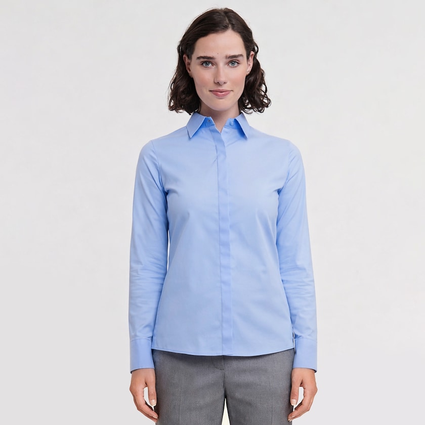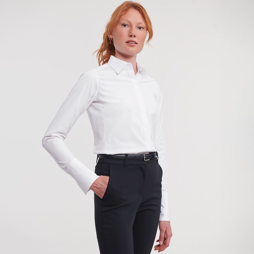 Dameskjorte af høj kvalitet i unikt stof med stretch. Skjortens stof indeholder det revolutionerende materiale LYCRA T400 der giver stoffet et blødt stretch. Stoffet er desuden af typen easy care og krøller meget sjældent. Leveres pakkede enkeltvis i plastposer. Findes også som herremodel.