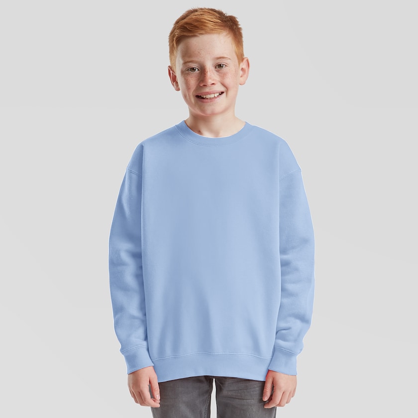 Slidstærk børnesweatshirt fra Fruit of the Loom. Den perfekte legekammerat! FOTL Kids Premium Set-in Sweat har en noget højere polyesterblanding end almindelige FOTL Kids Classic Set-in Sweat. Den er dermed mere modstandsdygtig, og klarer flere vaske end normalt. Leveres individuelt pakket i plastpose. Findes også som Voksenmodel.
