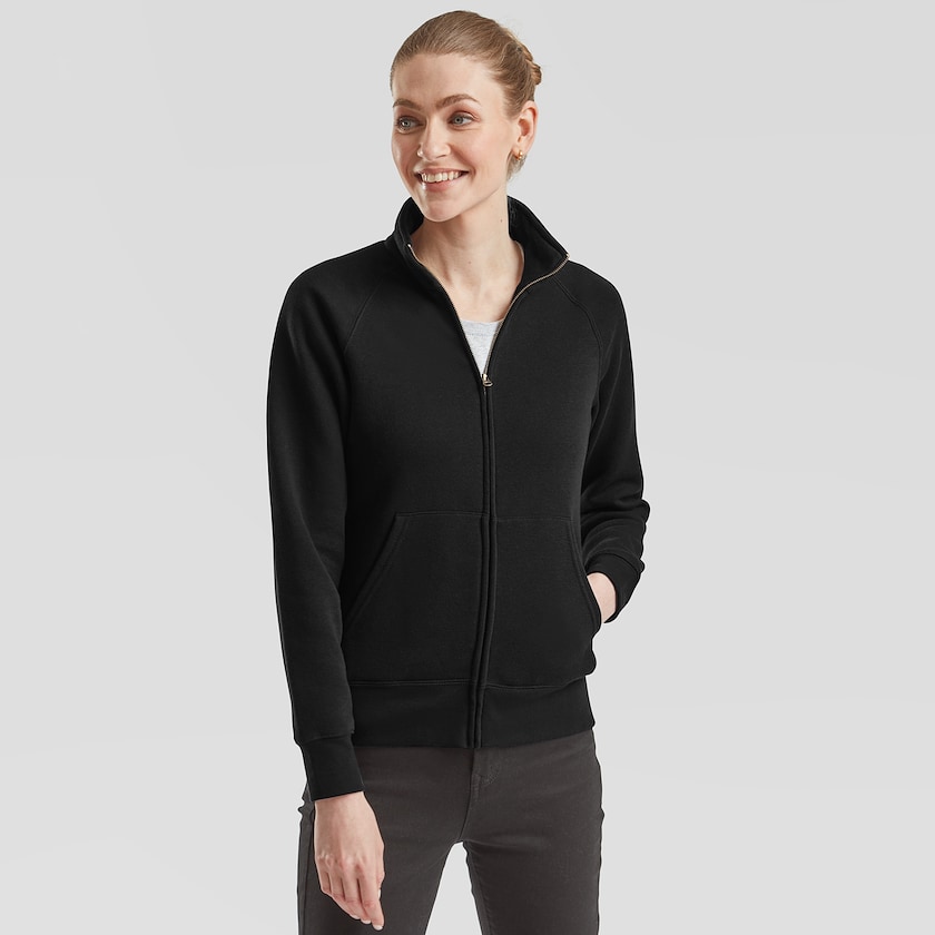 Figursyet trøje med høj krave og lang lynlås. Lady-Fit Premium Sweat Jacket er fremstillet i et stof med en lidt højere polyesterblanding, hvilket gør, at trøjen er mere slidstærk end normalt. Trøjerne leveres individuelt pakket i plastikpose. Findes også som herremodel.