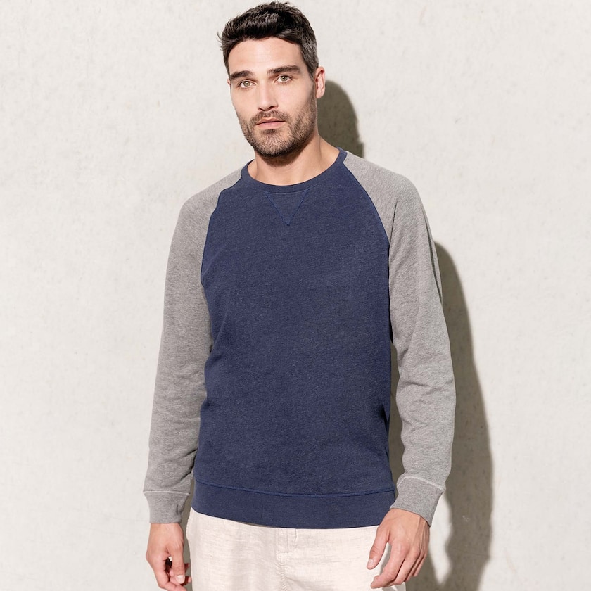 Tofarvet sweatshirt af miljøvenligt materiale. Trøjen er fremstillet af 80% økologisk bomuld og 20% polyester. Trøjerne leveres pakkede enkeltvis i plastposer. Findes også som damemodel.