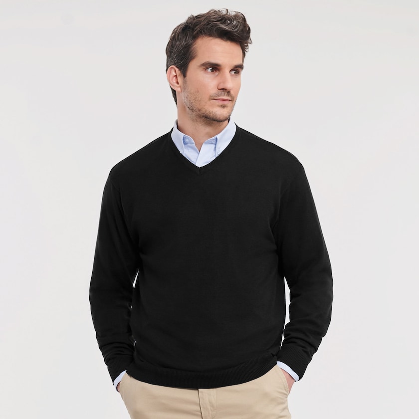 Elegant strikketrøje til herrer. Trøjen har en v-hals, og er fremstillet i en Easy Care bomuldsblanding, hvilket kombinerer bomuldens lethed med akrylens blødhed. Trøjen kan maskinvaskes op til 40 grader, og tåler tørretumbling. Den perfekte trøje til dig som ønsker et elegant alternativ. Trøjerne leveres enkeltvis pakket i plastikpose. Findes også som damemodel.
